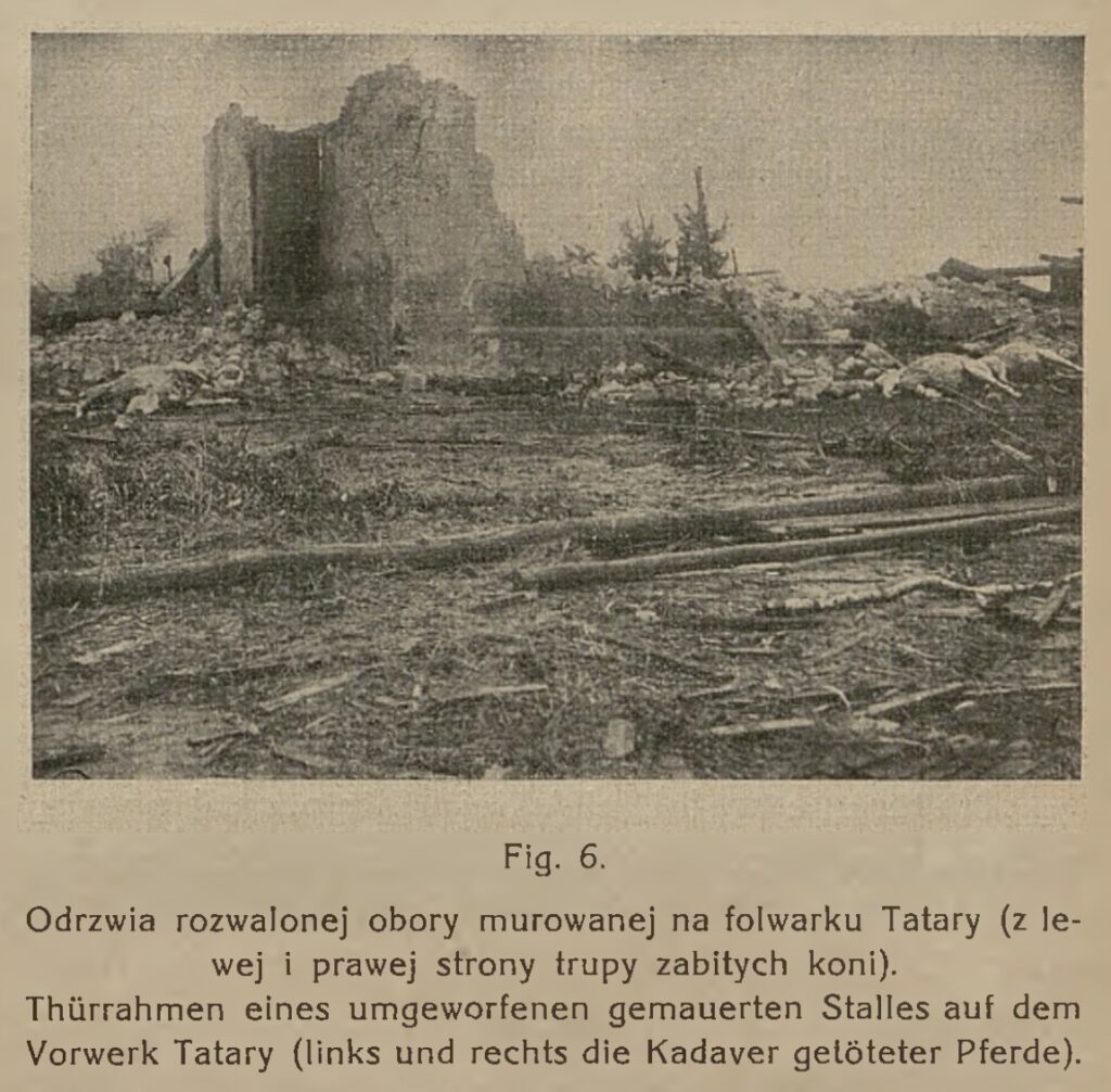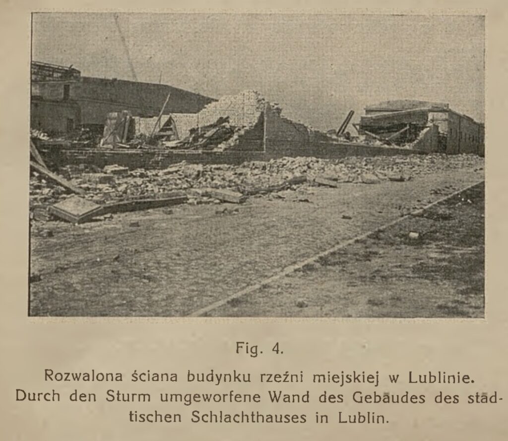 W rzeźni miejskiej runęła ściana jednego z nowo postawionych budynków — murowana, o grubości ponad pół metra. W folwarku Tatary zerwała całe piętro spichrza, rozwaliła obory, zabiła konie i bydło. Jeden ze stajennych został uniesiony z dachu i rzucony na sąsiedni budynek.